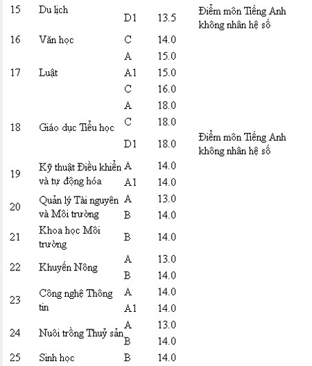 | 23 | Nông học (định hướng công nghệ cao) | D620109 | 40 | A | 13.0 | 15 | |
