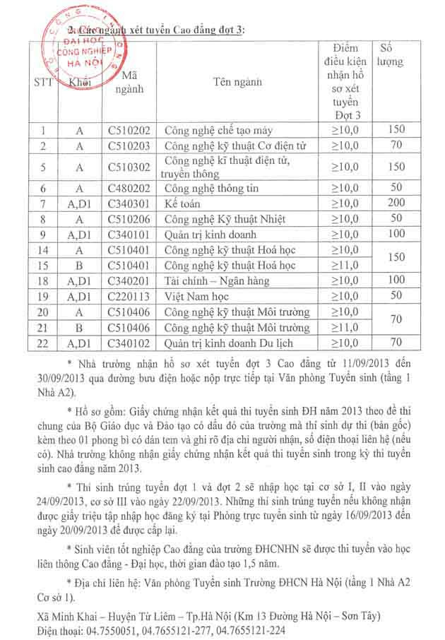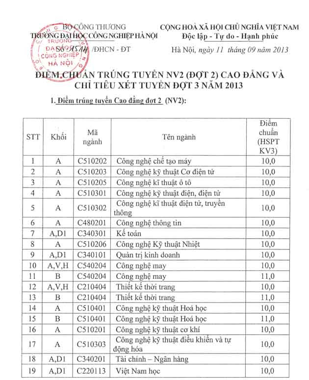 Những thí sinh đã nộp đăng ký xét tuyển NV2 (từ 20/8-10/09/2013) có kết quả thi lớn hơn hoặc bằng điểm chuẩn công bố dưới đây đã trúng tuyển vào hệ Cao đẳng chính quy của Trường ĐH Công nghiệp Hà Nội.