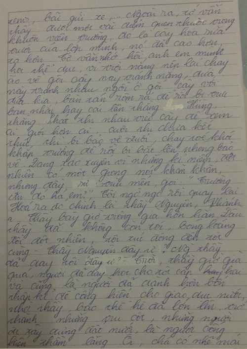 Đang xao xuyến vì những kỉ niệm, đột nhiên có một giọng nói khàn khàn, nhưng đầy sự trìu mến, gọi : "Trường Ân đó hả em?" Tôi ngờ ngờ rồi quay lại. Hóa ra đó chính là thầy Nguyên, Khánh. Thầy bây giờ trông đã già hơn hẳn. Đầu thầy đã không còn tóc, bóng loáng rồi đột nhiên, tôi xúc động đến tột cùng - thầy Nguyên đây ư? Người thầy đã dạy tôi "đây ư?" Trời, thầy giờ già quá, người đã dạy cho tôi cấp hai và cũng là người đã dành hơn bốn thập kỷ để cống hiến cho giáo dục nước, nhờ thầy, bao thế hệ đã lớn lên, trở thành những trụ cột, những người đi xây dựng đất nước, là người cống hiến thầm lặng...
