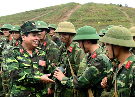 | Trung tướng Nguyễn Sĩ Thăng, Chính ủy Quân khu 1 động viên các chiến sĩ trẻ Sư đoàn 3 hoàn thành nhiệm vụ diễn tập. |