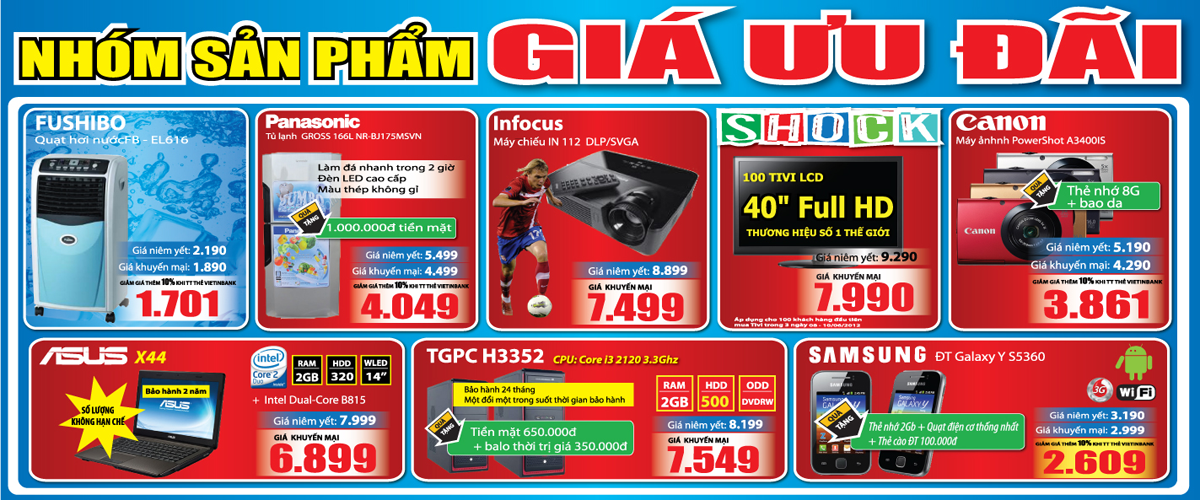 Máy chiếu IN 112 Infocus giá niêm yết 8.899.000đ, giá khuyến mại còn 7.499.000đ; máy in laser Canon LBP 6000 giá niêm yết 2.199.000đ, giá khuyến mại còn 1.899.000đ;