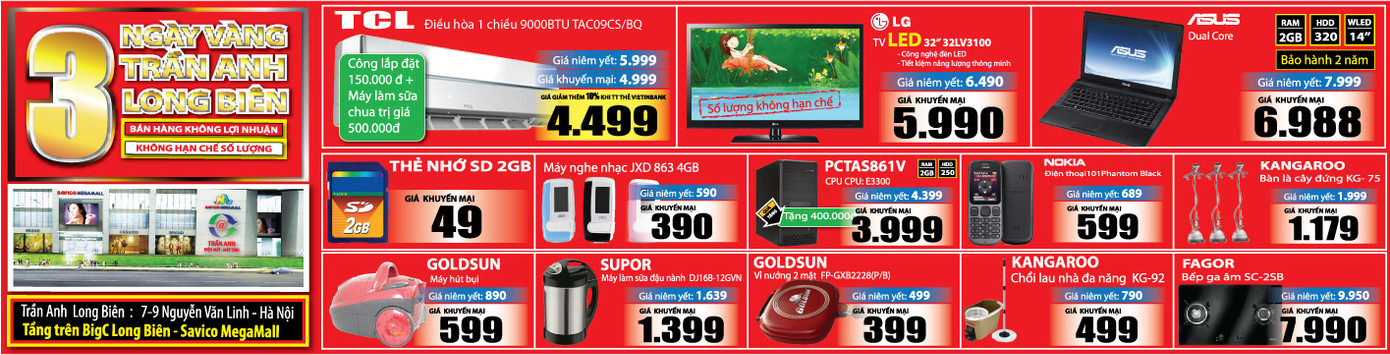 | Để tìm hiểu chi tiết về các sản phẩm và chương trình khuyến mãi, xin vui lòng liên hệ tại: Siêu thị Điện máy - Máy tính Trần Anh Siêu thị Trần Anh Long Biên: Tầng 2 Savico Megamall, 7-9 Nguyễn Văn Linh, Long Biên, Hà Nội Siêu thị Trần Anh Tây Sơn: 292 Tây Sơn, Đống Đa, Hà Nội (Đối diện Đại học Thủy Lợi) Siêu thị Trần Anh Láng: 1174 Đường Láng, Đống Đa, Hà Nội (Gần đầu ngã tư Cầu Giấy) Điện thoại: 1900.545.545 |