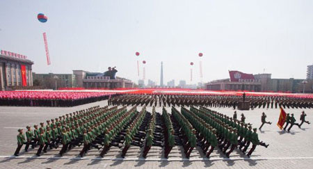 Triều Tiên hôm nay tiến hành lễ diễu binh nhằm kỷ niệm 100 năm ngày sinh của nhà lãnh đạo sáng lập Kim Nhật Thành và nhằm ủng hộ tân lãnh đạo Kim Jong-un, hai ngày sau vụ phóng tên lửa bất thành bị cộng đồng quốc tế lên án.