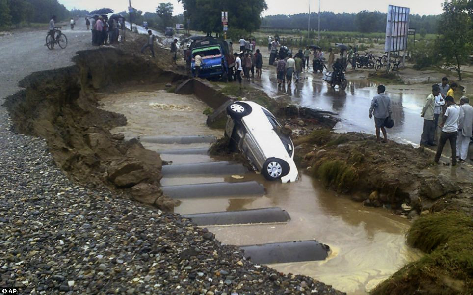 | Mưa lũ cuốn trôi nhà cửa, đường xá và cả xe cộ. |