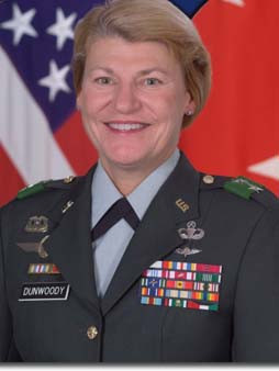 Bà Dunwoody đã từng giữ nhiều trọng trách chỉ huy trong quân đội kể từ khi gia nhập lực lượng Lục quân Mỹ vào năm 1975. Hiện nay, bà là Phó tham mưu trưởng Lục quân phụ trách hậu cần và là 1 trong 5 nữ tướng 3 sao trong quân đội Mỹ.