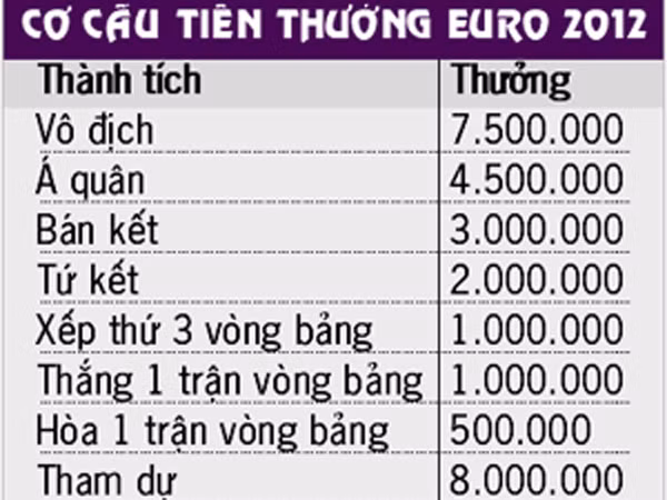 Tổng số tiền thưởng mà UEFA sẽ chi cho các đội tuyển tới Ba Lan và Ukraine tại EURO 2012 lên tới 196 triệu euro, so với 184 triệu của EURO 2008 và 126 triệu euro của EURO 2004.