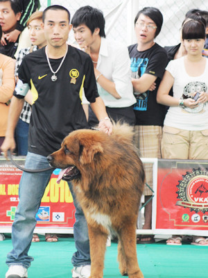 Nhưng có lẽ ấn tượng nhất chính là chú chó được mệnh danh là chó sư tử. Nguồn gốc của chú cẩu khổng lồ này ở tận xứ Tây Tạng, mà người Trung Quốc thường gọi là chó Ngao Tây Tạng. Những chú Ngao trưởng thành thường đạt trọng lượng gần 100kg, với đôi bờm lông vàng sậm phủ xuống, ôm trọn mặt, thoạt trông không khác gì loài sư tử. Con Thiên Long của anh Kỳ, một người chơi chó cảnh tại TPHCM đã xứng đáng trở thành “Nam Vương” của ngày hội với kích thước khổng lồ, nặng gần 80kg!