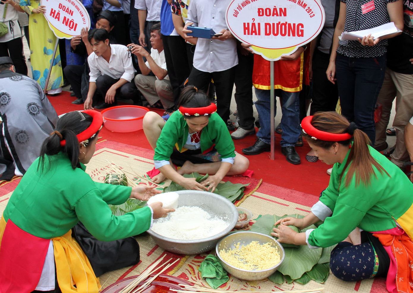 Những sản vật do người dân được Vua Hùng dạy trồng lúa xa xưa, nay tái hiện trong hội thi tưng bừng: Gói và nấu bánh chưng, bánh dầy, biểu trưng của trời, đất, được chế biến từ hạt lúa nếp thơm, rồi cung tiến Vua Hùng.