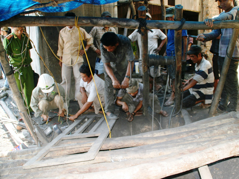 Công nhân thay phiên nhau xuống hầm để tìm kiếm hai nạn nhân.
