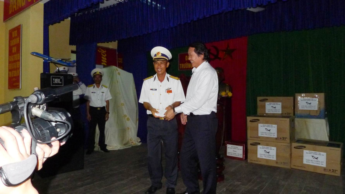 Thay mặt Bộ GTVT, Bộ trưởng Thăng gửi tặng những món quà thiết thực tới quân và dân Thị trấn Trường Sa.