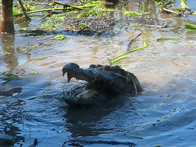 Vừa ra khỏi bờ được mấy tay chèo, Hạnh phát hiện một cá sấu to nằm trên cồn trước mặt. Thuyền lướt nhẹ về hướng đó. Con cá sấu màu xám này có vẻ ngoài trễ nải, lười nhác.