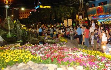 Tại đường hoa Nguyễn Huệ hàng ngàn người dân, du khách quốc tế cũng nô nức đến đây để vui chơi, chiêm ngưỡng các tác phẩm nghệ thuật làm cho không khí đón năm mới thêm phần nhộn nhịp.
