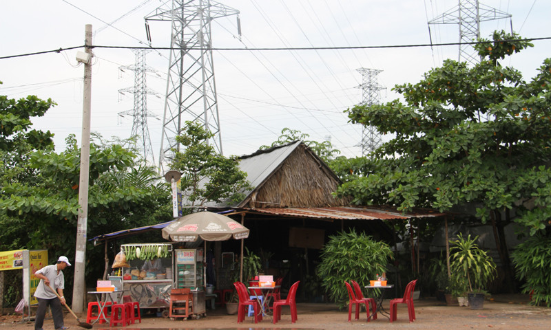 | Tình trạng dùng trụ điện làm nhà, làm nơi chất chứa hàng hóa hoặc xây nhà bao quanh trụ điện cao thế cũng rất phổ biến. Tại một góc khác của trạm biến áp 500 kV Tân Định, một ngôi nhà trên mặt đường Huỳnh Văn Lũy áp sát vào một trụ điện cao thế. Nhà có tường gạch, mái tôn kết hợp tre lá dễ cháy. Đây còn là một quán cà phê sân vườn nên có nhiều khách ra vào. |