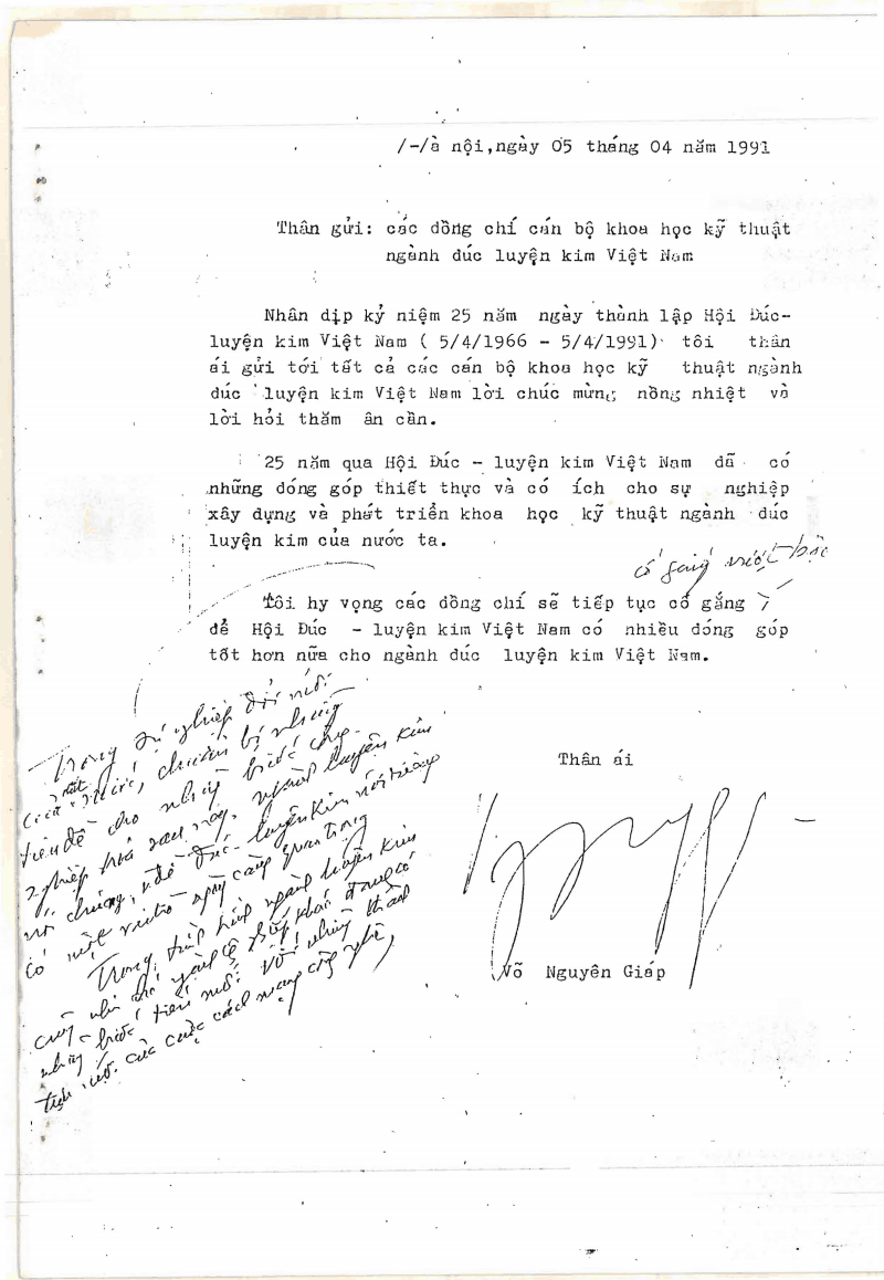 Sau này Tướng Giáp vẫn thường xuyên quan tâm đến hoạt động của các của các Hội khoa học. Hồi tôi làm Chủ tịch Hội đúc luyện kim Việt Nam, ông hai lần gửi thư đến Hội cho ý kiến chỉ đạo. Tôi vẫn còn giữ cả hai lá thư kèm cả bản thảo có nét bút của Tướng Giáp, đúng như nét bút trong bức điện mật “Thần tốc, thần tốc…táo báo, táo bạo..” của Tướng Giáp gửi vào Mặt trận mùa xuân năm năm 1975. Đọc thư của Tướng Giáp, mới thấy hết sự quan tâm của ông đối với hoạt động của Hội, mới thấy hết sự trăn trở của ông khi chỉnh sửa lại từng câu chữ trong bản thảo của thư ký và sự thận trọng của ông khi dùng từ để diễn đạt đủ ý muốn nói, muốn đặn dò. Đúng Tướng Giáp vừa là Tướng Võ vừa là Thầy Văn. Lĩnh vực nào người cũng xuất sắc. Thật Văn Võ Song Toàn !