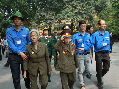 Thanh niên tình nguyện đưa các cựu chiến binh vào viếng.