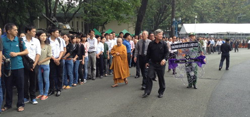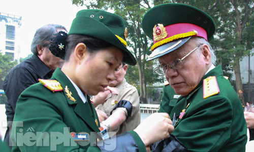 12h05: Trong dòng người đặc kín chờ xếp hàng vào viếng Đại tướng trưa nay, nhiều người mang theo di ảnh Đại tướng, có người vẫn cầm hoa, hương đến viếng. Những người đầu tiên may mắn được xếp hàng vào viếng không giấu nổi xúc động, nghẹn ngào. Nhiều cụ già rơi nước mắt vì cảm động. Họ đã chờ đợi giây phút này từ mấy ngày nay. Thanh niên tình nguyện đưa các cựu chiến binh vào viếng. 12h05: