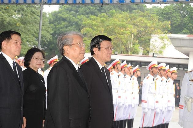 Chủ tịch nước Trương Tấn Sang dẫn đầu đoàn Chủ tịch nước vào viếng. Điệu nhạc “hồn tử sĩ” vang lên, cả nhà tang lễ lặng phắc.