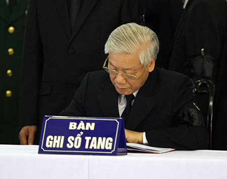 Vô cùng thương tiếc đồng chí Đại tướng Võ Nguyên Giáp – Anh Văn, nhà lãnh đạo có uy tín lớn của Đảng, Nhà nước và nhân dân ta; người học trò xuất sắc và gần gũi của Chủ tịch Hồ Chí Minh; người chiến sĩ cách mạng kiên trung; nhà lãnh đạo quân sự tài năng xuất chúng; vị Đại tướng, Bộ trưởng Bộ Quốc phòng, Tổng Tư lệnh đầu tiên và Người Anh Cả của Quân đội nhân dân Việt Nam; người đã có nhiều công lao to lớn và cống hiến đặc biệt xuất sắc đối với sự nghiệp cách mạng của Đảng và dân tộc.