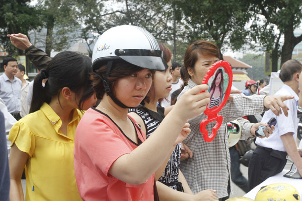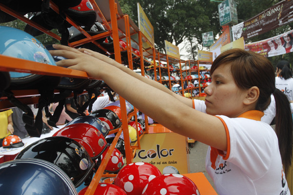 | Điểm đổi mũ bảo hiểm trợ giá tại trước cổng công viên Thống Nhất, Hà Nội. |