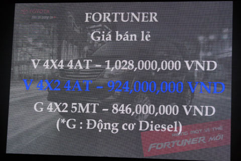 Về giá, phiên bản Fortuner máy dầu 4x2 có giá 846 triệu đồng. Phiên bản động cơ xăng 4x2 số tự động có giá 924 triệu đồng. Phiên bản động cơ xăng số tự động và dẫn động 2 cầu có giá 1.028 triệu đồng. Sản phẩm mục tiêu của Toyota là Fortuner động cơ xăng sử dụng hộp số tự động và dẫn động 1 cầu 4x2, phù hợp cho điều kiện giao thông đô thị.