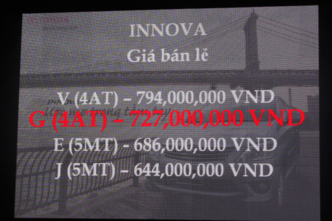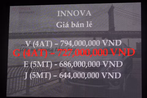 Về giá, Innova J sử dụng hộp số tay 5 cấp có giá 644 triệu đồng, rẻ nhất. Innova E số sàn có giá 686 triệu đồng. Hai phiên bản số tự động là Innova G và Innova V có giá lần lượt là 727 triệu đồng và 794 triệu đồng. Trong đó, phiên bản Innova G được TMV kì vọng lớn nhất, với nâng cấp từ số sàn lên số tự động.