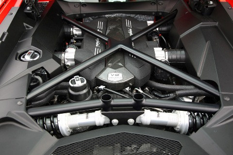 Dưới những tấm kính trong suốt là động cơ 6.5L V12. Công nghệ tối tân cho khối động cơ có trọng lượng chỉ 235 kg, cùng kích thước nhỏ gọn, nhưng có sức mạnh rất đáng nể. Aventador LP700-4 mang tới công suất tối đa 700 mã lực và mô men xoắn cực đại 690 Nm.