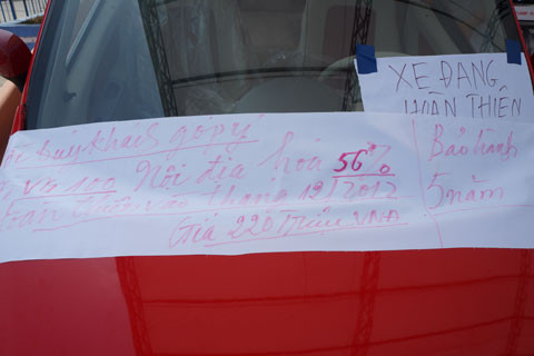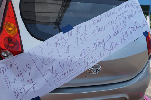 Hai chiếc xe đều được dán những mảnh giấy lớn, trên đó là những dòng chữ viết vội, đại ý là, xe đang hoàn thiện, mời quý vị góp ý!