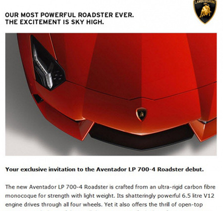 Tờ giấy mời ghi chú “đây là mẫu roadster mạnh mẽ nhất trong lịch sử của chúng tôi, hứa hẹn sẽ cực kỳ phấn khích” và cho biết thêm Aventador LP700-4 Roadster được “ứng dụng khung gầm liền khối từ sợi các bon siêu cường để tăng độ cứng cáp và giảm trọng lượng”.