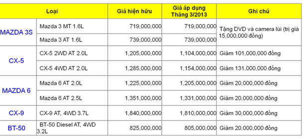 Theo đó, từ ngày 1-3-2013, giá một số mẫu xe Mazda như Mazda 2, Mazda 3, Mazda CX-5, Mazda 6, CX9 và BT-50 đều có mức giảm tối đa từ 20 triệu đồng đến 131 triệu đồng.