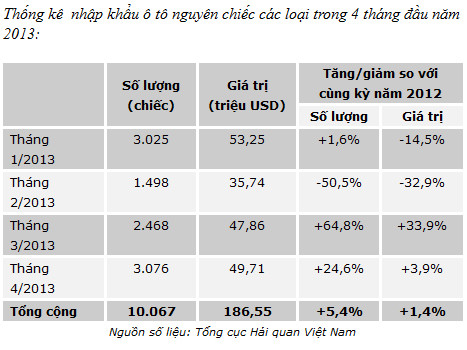 Theo số liệu thống kê sơ bộ của Tổng cục Hải quan công bố ngày 15/5, nhập khẩu ôtô nguyên chiếc các loại vào Việt Nam trong tháng 4 đạt 3.076 xe, trị giá 49,7 triệu USD, tăng gần 25% về lượng và 4% về giá trị so với một tháng trước đó. Như vậy, trong 4 tháng đầu năm nay đã có hai tháng (tháng 1 và tháng 4) lượng xe nhập khẩu vượt mức 3.000 chiếc.