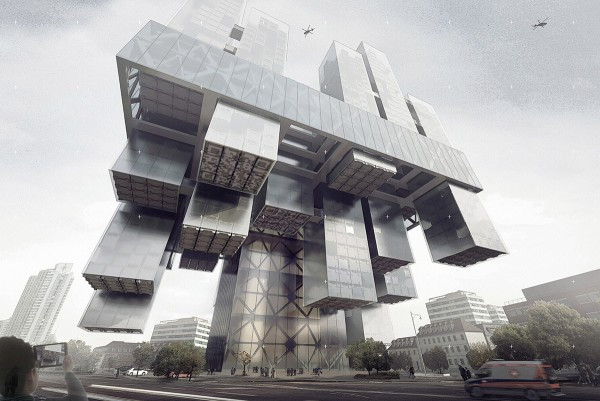 Tòa nhà The Hive là một trạm kiểm soát thẳng đứng dành cho các máy bay không người lái, tại đây sẽ quản lý những máy bay không người lái trong việc vận chuyển các gói hàng và vật dụng cho người dân ở New York. Được thiết kế bởi Hadeel Ayed Mohammad, Yifeng Zhao, và Chengda Zhu ở Mỹ.