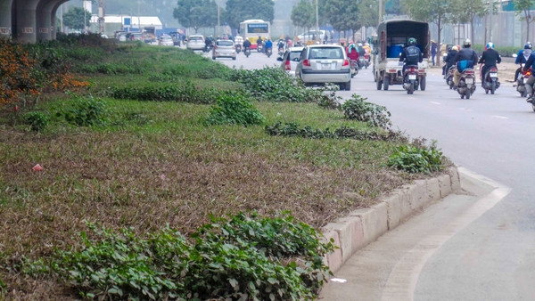 Dải phân cách lớn rất thừa thãi khi thảm thực vật “nghèo nàn” và chỉ để dựng biển quảng cáo, tuyên truyền.