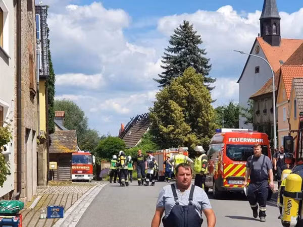 Xe cứu hỏa và cảnh sát cùng lao tới bưu điện sau khi nghe tin về bưu phẩm có "khí độc". Ảnh: Betreuungsdienst BRK KV Schweinfurt.