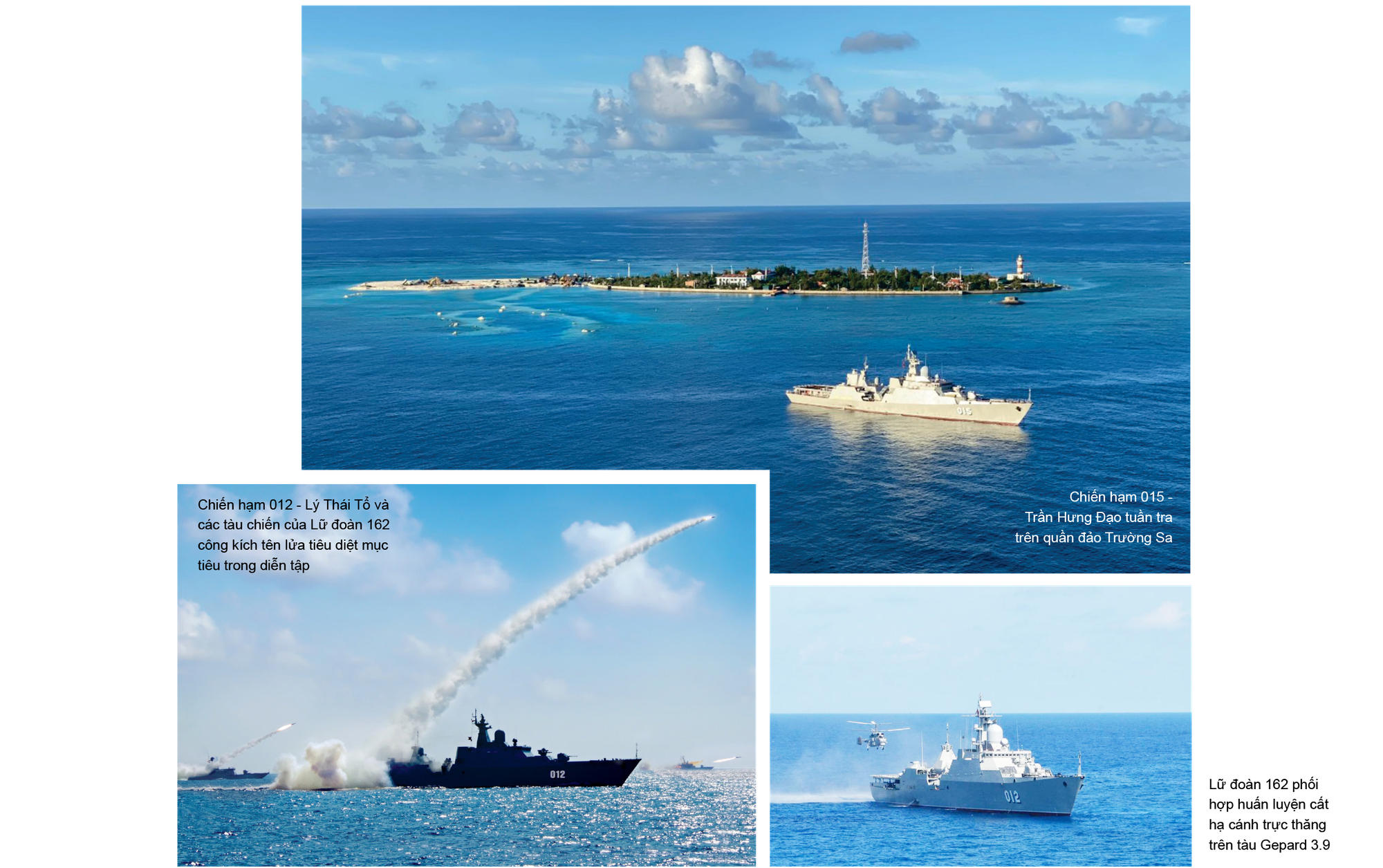 | Hai tàu hộ vệ tên lửa hiện đại 015 - Trần Hưng Đạo và 016 - Quang Trung của Lữ đoàn 162 dẫn đầu các chiến hạm luyện tập vận động đội hình trên biển |