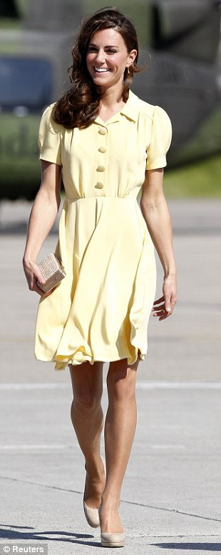 Váy lụa màu cùng giày cao gót là lựa chọn của tân công nương khi xuất hiện ở sân bay Calgary sau một ngày cùng hoàng tử William ở vùng núi Rockies.