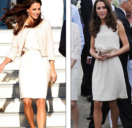 Trong một chuyến thăm Học viện nghệ thuật Inner Ciy tại Los Angeles (Mỹ), công nương Kate diện váy màu kem (phải) của Whistles, tôn thêm vẻ đẹp sang trọng và kín đáo.