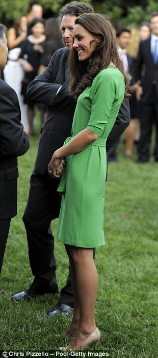 Vẫn là đôi giày cao gót nhưng công nương lại chọn kết hợp với chiếc váy màu xanh lá cây đậm Vajes của nhà thiết kế Diane von Furstenberg và chiếc túi xách tay Lytten (trái)