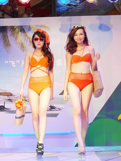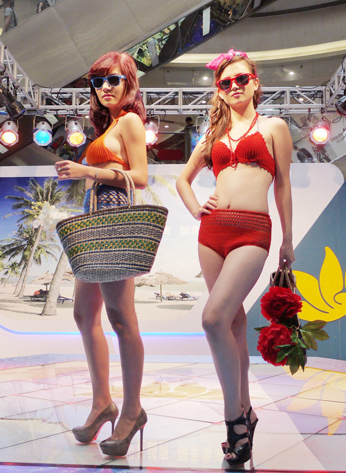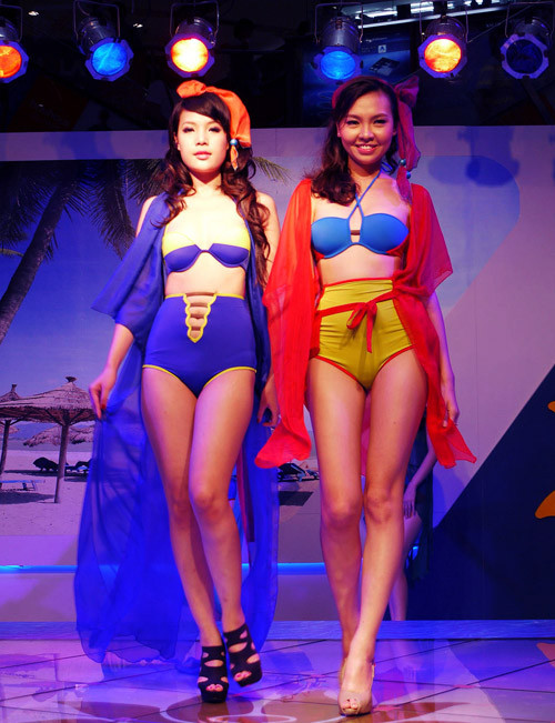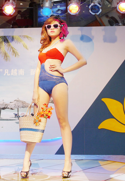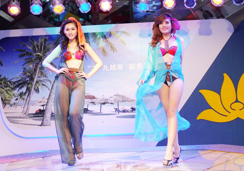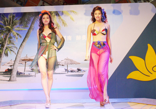Các người mẫu của công ty Elite Việt Nam trình diễn thời trang áo tắm của nhà thiết kế Kiều Diễm. Ngoài bikini, dàn chân dài còn biểu diễn thời trang áo dài, áo tứ thân.