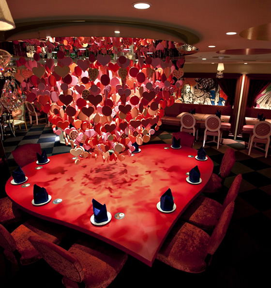 Nhà hàng có kiến trúc rất đặc biệt, thiết kế vô cùng tỉ mỉ, ngay từ những chi tiết dù nhỏ nhất. Các bức tường dọc hành lang in lại một số hình ảnh trong truyện, bàn hình trái tim, bàn in hình quân bài...