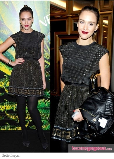 Jessica Alba tham dự show diễn thời trang của H&M Versace với một trong những thiết kế từ bộ sưu tập của hãng. Cô ấy trông thật mạnh mẽ và cá tính khi diện màu đen và trang điểm son môi màu đỏ đậm.