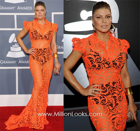 Fergie nổi bật với chiếc váy màu cam của thương hiệu Jean Paul Gaultier.