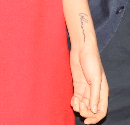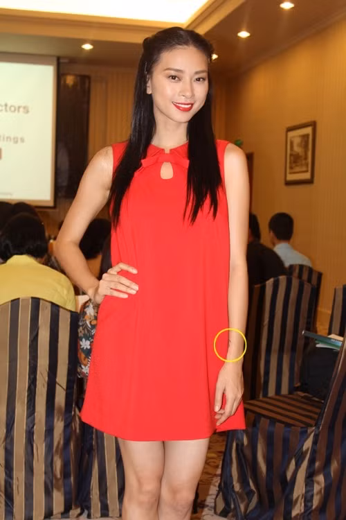 Nếu bạn nhìn kĩ, bạn sẽ thấy được một hình xăm nhỏ như kiểu dòng chữ ở tay phải của MC Nguyễn Cao Kỳ Duyên mỗi khi người đẹp này "diện" váy/áo ngắn trên khuỷu tay.