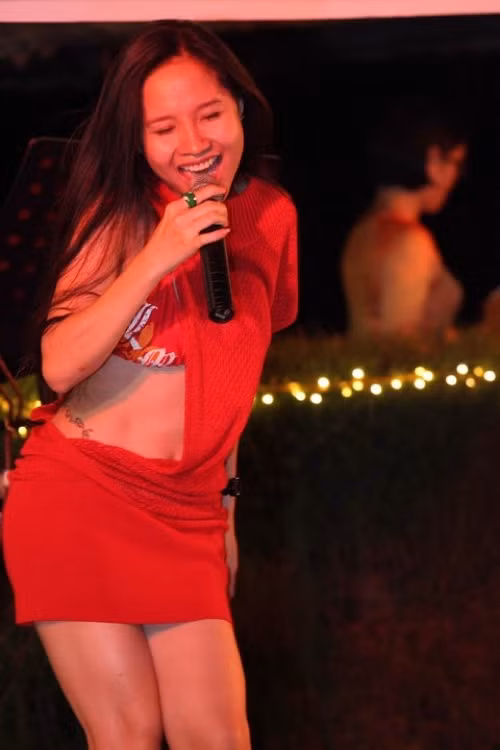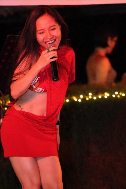 Hồng Ngọc thường mặc quần trễ vào kéo áo hơi cao một chút, để lộ hình xăm phần eo sau lưng.