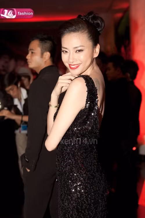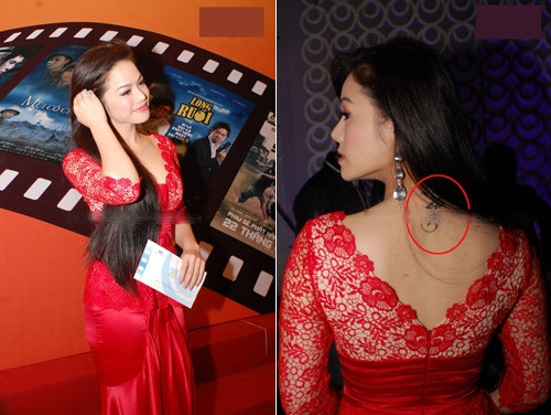Ca sĩ Nhật Kim Anh cũng có cách khoe hình xăm rất duyên dáng khi mặc váy khoét lưng và nhẹ nhàng vuốt tóc lệch sang bên, để hình xăm "ẩn hiện" sau làn tóc.