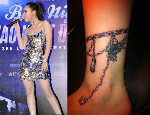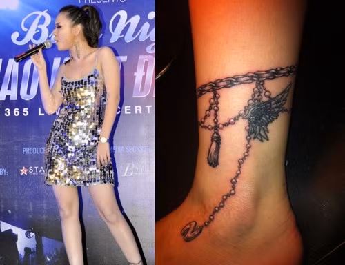 ... còn có thêm hình xăm sợi xích cùng cánh thiên thần ở cổ chân, trông khá lạ mắt và ấn tượng mỗi khi cô nàng diện váy ngắn "sexy".