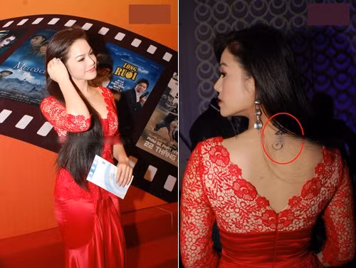 Tina Tình thường chọn váy quây hở lưng để "khoe khéo" hình xăm là dòng chữ Hán chạy dọc sống lưng.
