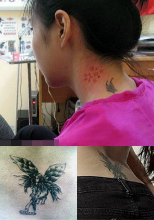 ... và một hình lớn hơn ở sau lưng, bên vai phải. Bởi vậy, cô nàng thường xuyên chọn những kiểu áo quây để có thể "khoe trọn" được cả hình xăm trước và sau.