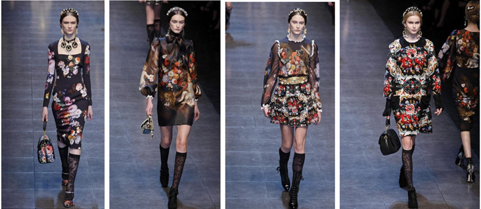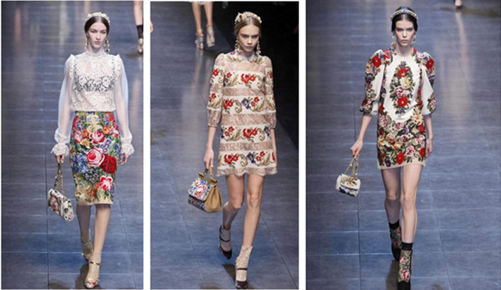 Dolce & Gabbana sử dụng kỹ thuật trang trí những hình in hoa, thêu từ thiết kế váy đầm, jumsuit cho đến những phụ kiện như giày và túi vô cùng tinh xảo và lộng lẫy.