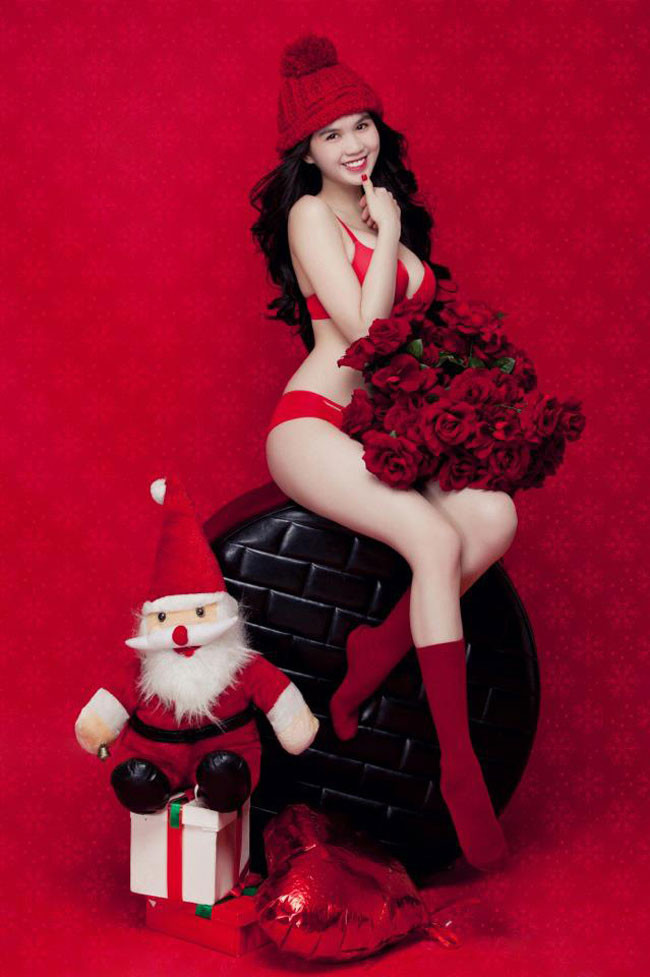 Thân hình mơn mởn, mềm mại, nước da trắng ngần được phô diễn trong bộ nội y mùa Noel với tone màu đặc trưng là trắng, xanh và đỏ sẽ khiến tất thảy phải ngẩn ngơ. Ngọc Trinh như hóa thân thành công chúa tuyết sexy làm ấm lòng người trong không khí giá lạnh trước thềm Giáng sinh.