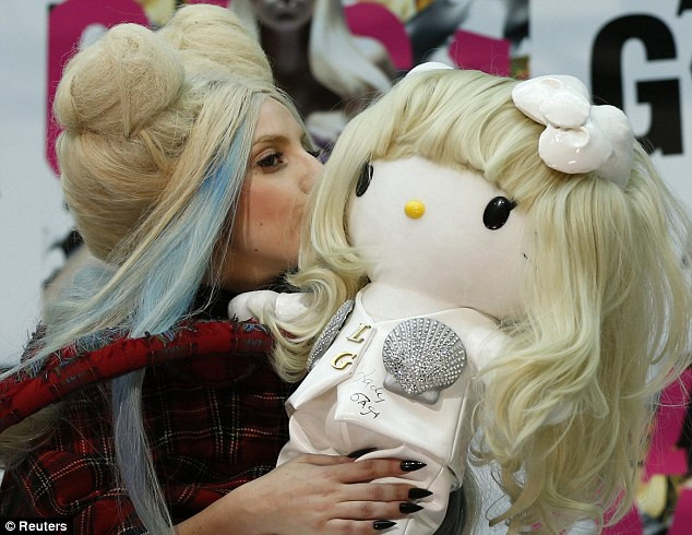 Chưa dừng ở đó, Lady Gaga còn đem theo rất nhiều búp bê và hình nộm của chính mình. Một trong số đó là chú mèo Hello Kitty với bộ tóc giả của Gaga.